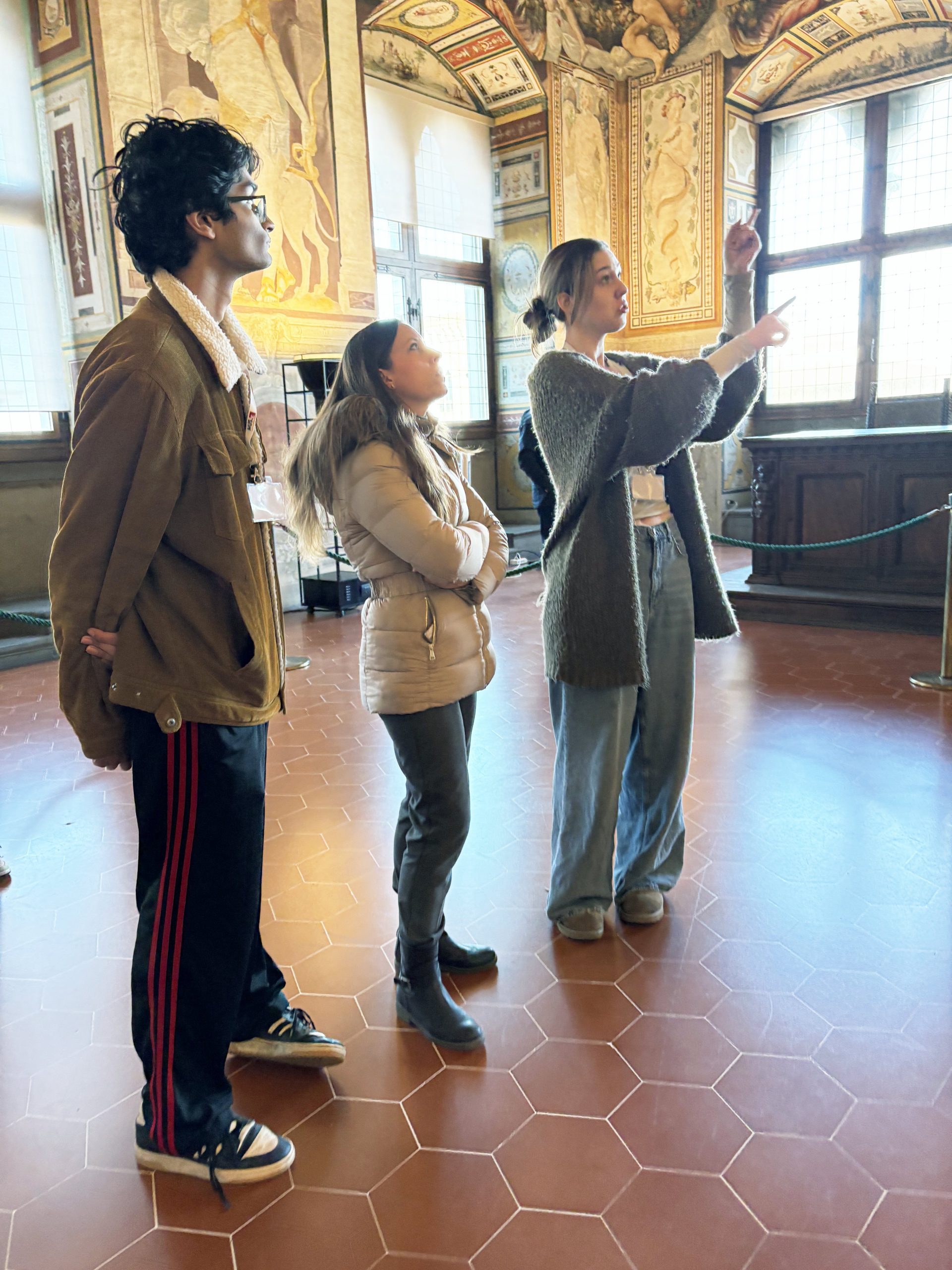 Corazzini explained that the internship has a twofold purpose. During the first part of the semester, students gain a deeper knowledge of one of the most important Florentine monuments, Palazzo Vecchio, rich in both art and history. After the break, students learn to lead art history tours and develop skills to communicate effectively with a varied audience ranging from kids to senior tourists.