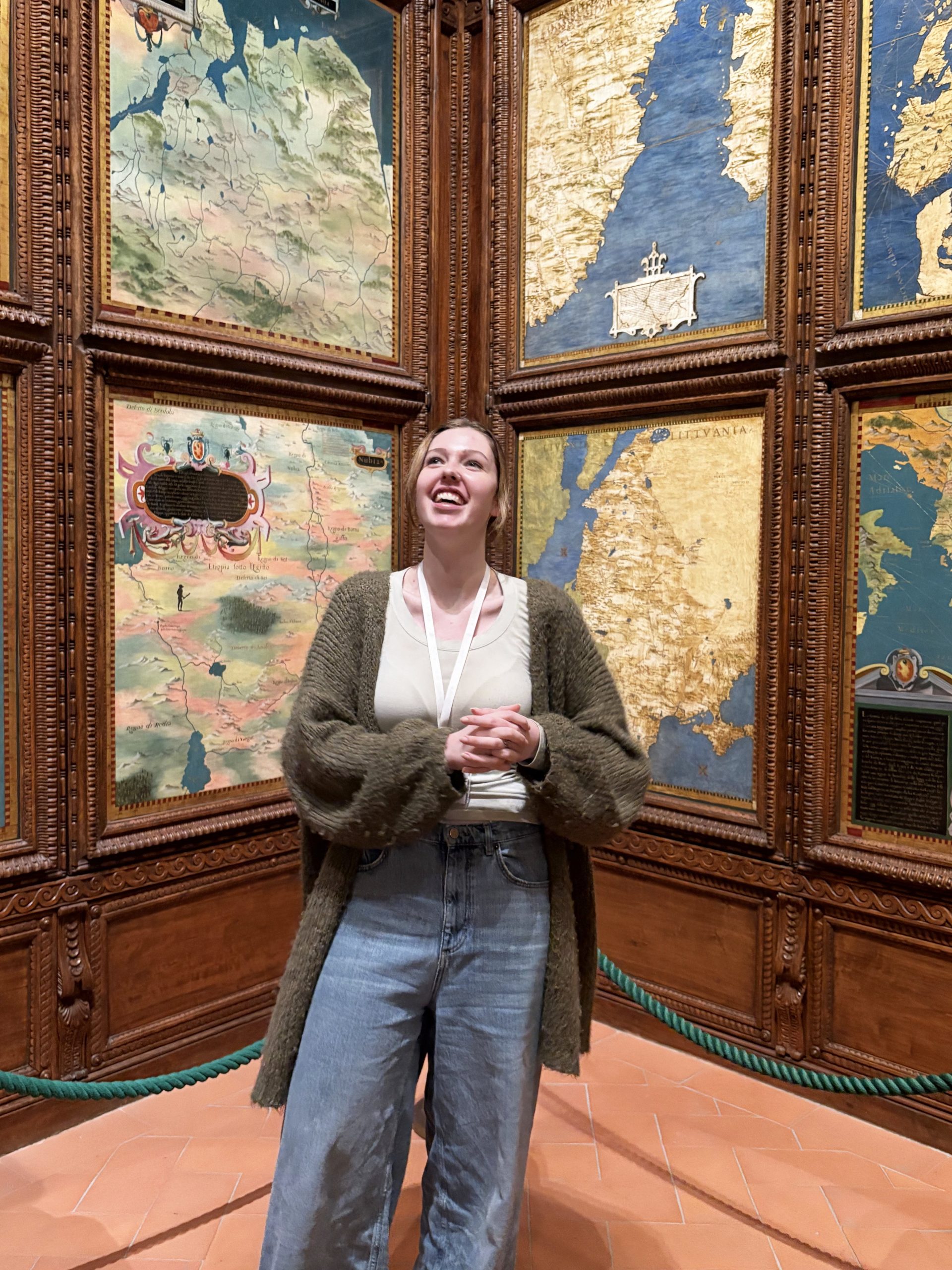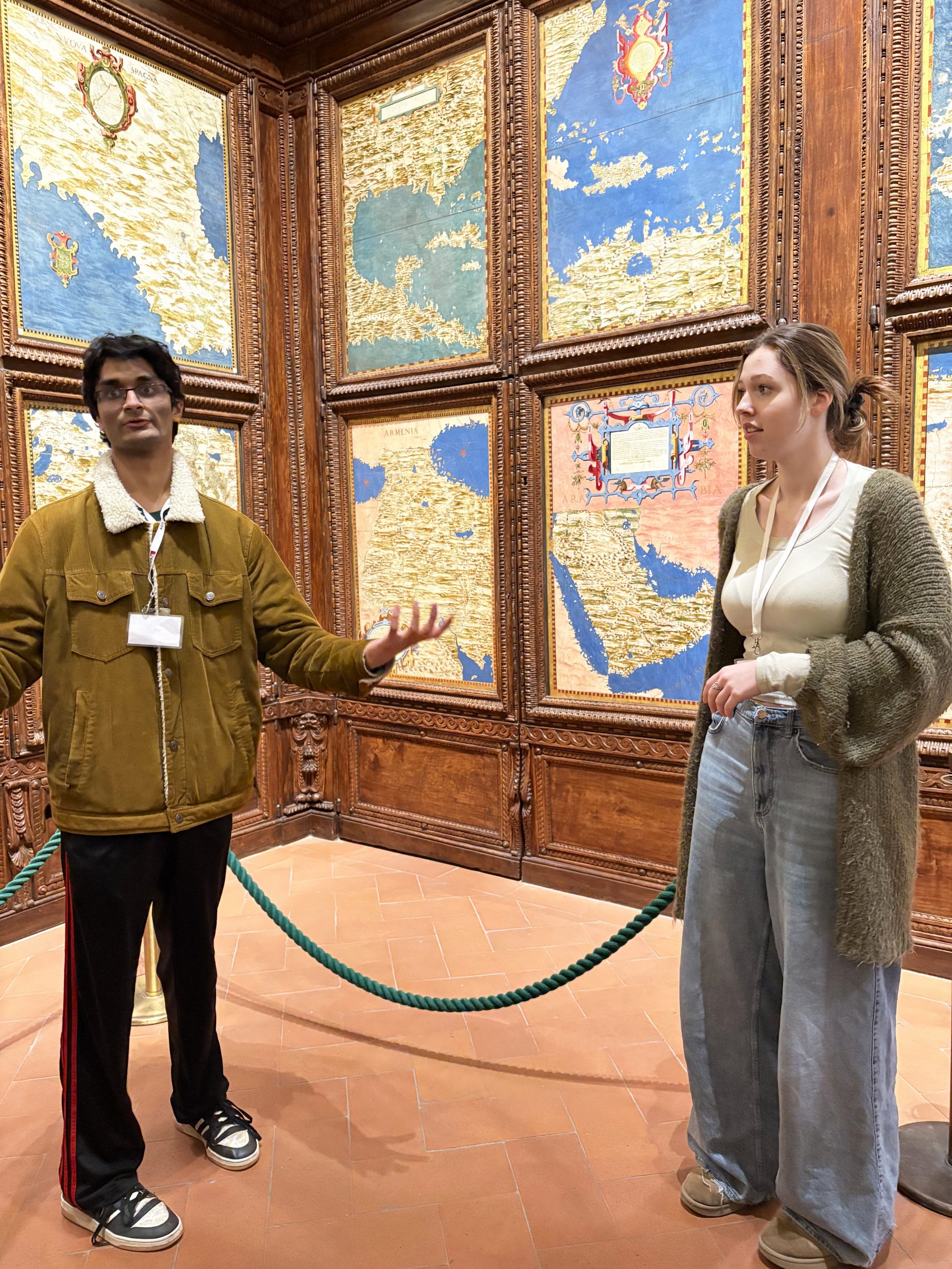 “I was impressed by the confidence both Saketh and Madison displayed, considering they had only started this internship a month ago. Each student had their unique perspective and their own way of delivering the material which made the tour even more interesting. We explored the political chambers and the Medici’s private rooms. But, the room that impressed me the most was the Room of Maps with ancient geographical maps depicting the known world at that time. Through a secret passage, hidden behind one of the maps, we were led onto an amazing, secluded terrace where we took some lovely pictures. Thank you, Saketh and Madison, for the amazing tour you gave!”