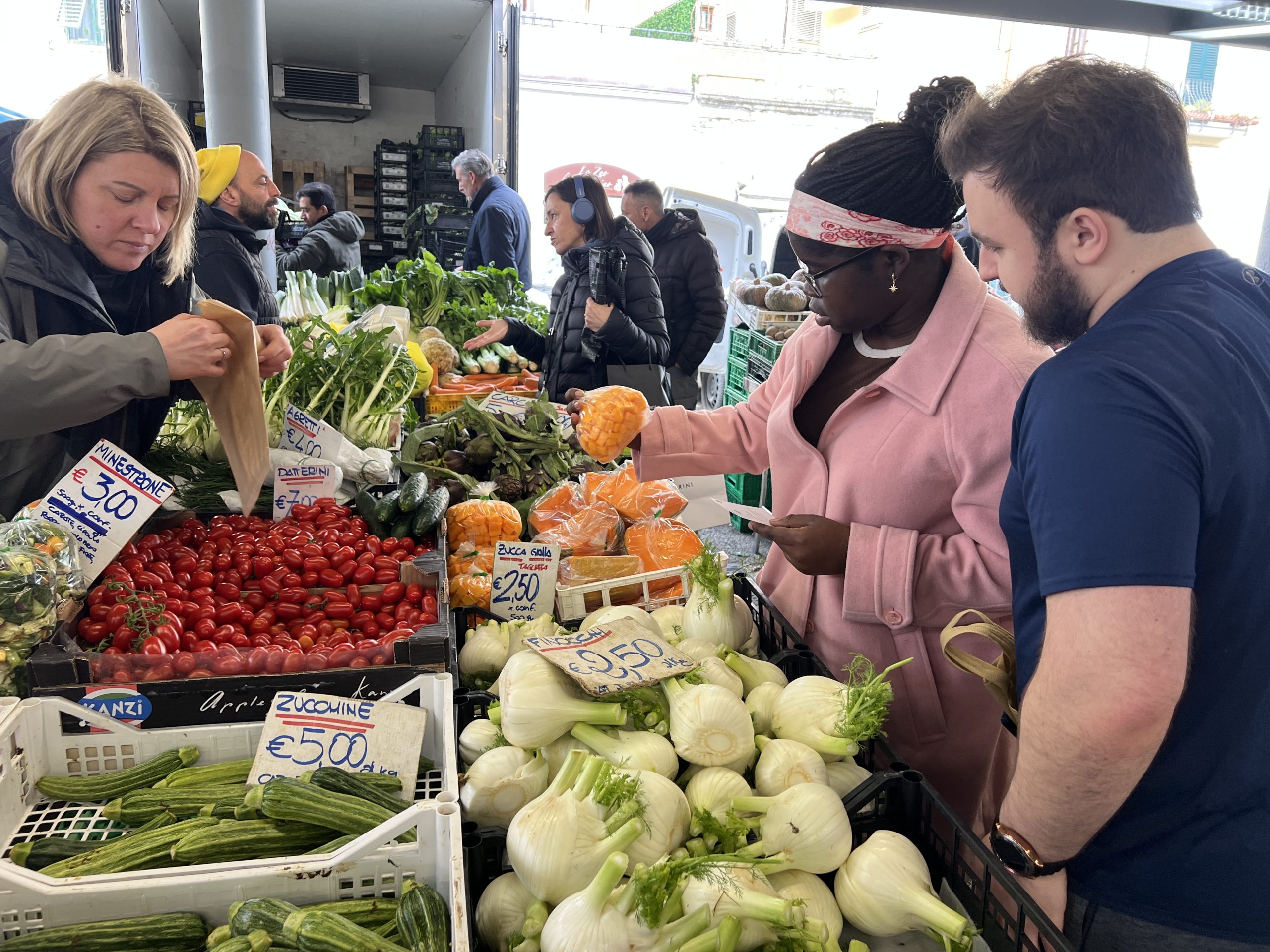 After breakfast, the four teams set out with grocery lists in hand and a €10 budget, wandering through the busy Sant’Ambrogio Market to purchase fresh, seasonal ingredients from local vendors. Through this hands-on adventure, they practiced Italian language skills and discovered the region’s flavors.