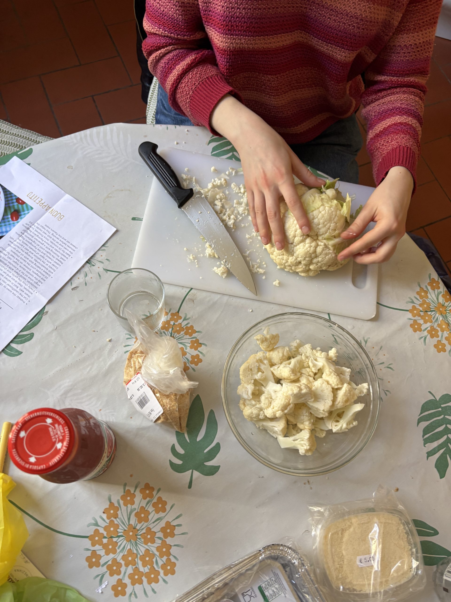 Once the grocery shopping was done and they had found all the ingredients on their lists, students returned home to cook authentic Tuscan dishes, following our vegetarian recipes, such as Orecchiette ai Broccoli, Paccheri con la Zucca, Fagioli all’Uccelletto, Parmigiana di Cavolfiore (ENG. broccoli and pumpkin sauces for pasta, tomato sauce beans, and cauliflower parmigiana).