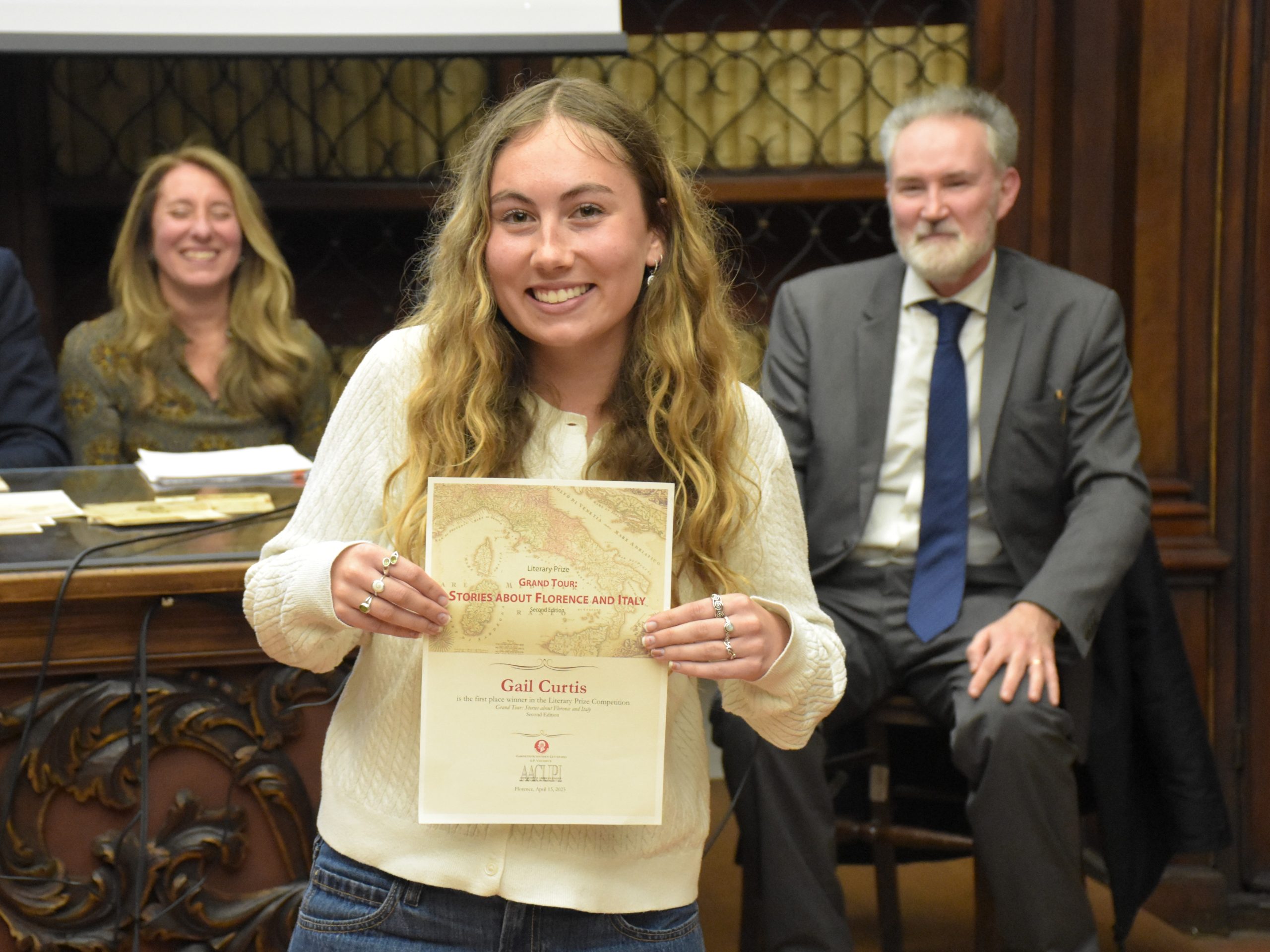 On April 15th the award ceremony of the 2024/2025 edition of the AACUPI-Vieusseux Grand Tour Literary Prize took place in the Sala Ferri at Palazzo Strozzi, Florence. The jury — consisting of ISI Florence director Stefano U. Baldassarri, Fabrizio Ricciardelli (AACUPI president and director of the Kent State University Florence program), Franco Zabagli (Vieusseux Institute), former AACUPI president Portia Prebys, and professors Anna Gravina (Kent State University Florence program) and Nicoletta Peluffo (NYU in Florence) — decided to award the first prize to Gail Curtis (IES Abroad, Siena) for her short story titled “A Home in Siena.” As the members of the jury wrote in their decision, the winner “has succeeded at joining the years she spent in the US with her stay (though brief) in Italy. In an original, sensitive, and insightful way, her prose compares her hometown in the US and the city where she has studied in Italy. Gail Curtis thus highlights both differences and similarities, not only through her own memories and daily life but also relying on impressions by famous English-speaking writers such as Nathaniel Hawthorne, Charles Dickens, and Virginia Woolf. Her metaphoric language often comes across as particularly lively and emotionally engaging, also thanks to the personification of the very places she describes. All this makes her prose at once more suggestive and sincere.” The winning short story will be published in the fall issue of the prestigious “Antologia Vieusseux” together with its Italian translation.